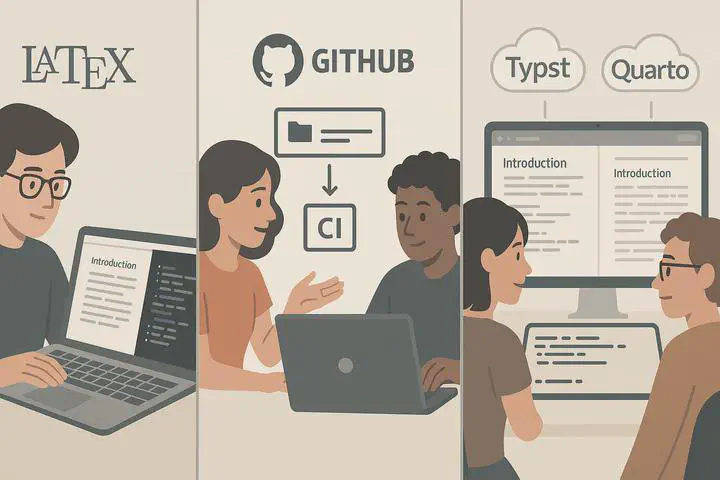 Hybrid | GitHub/GitLab CI, Quarto projects, Typst + Git | Teams using Git, reproducible research |